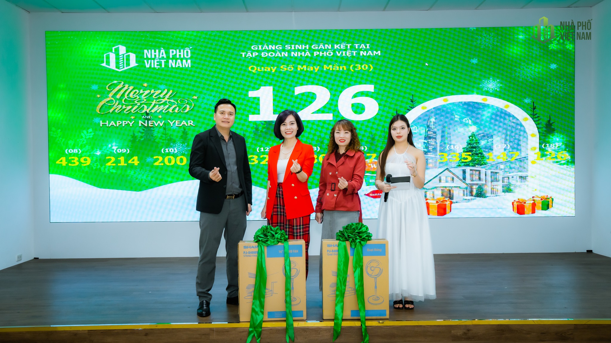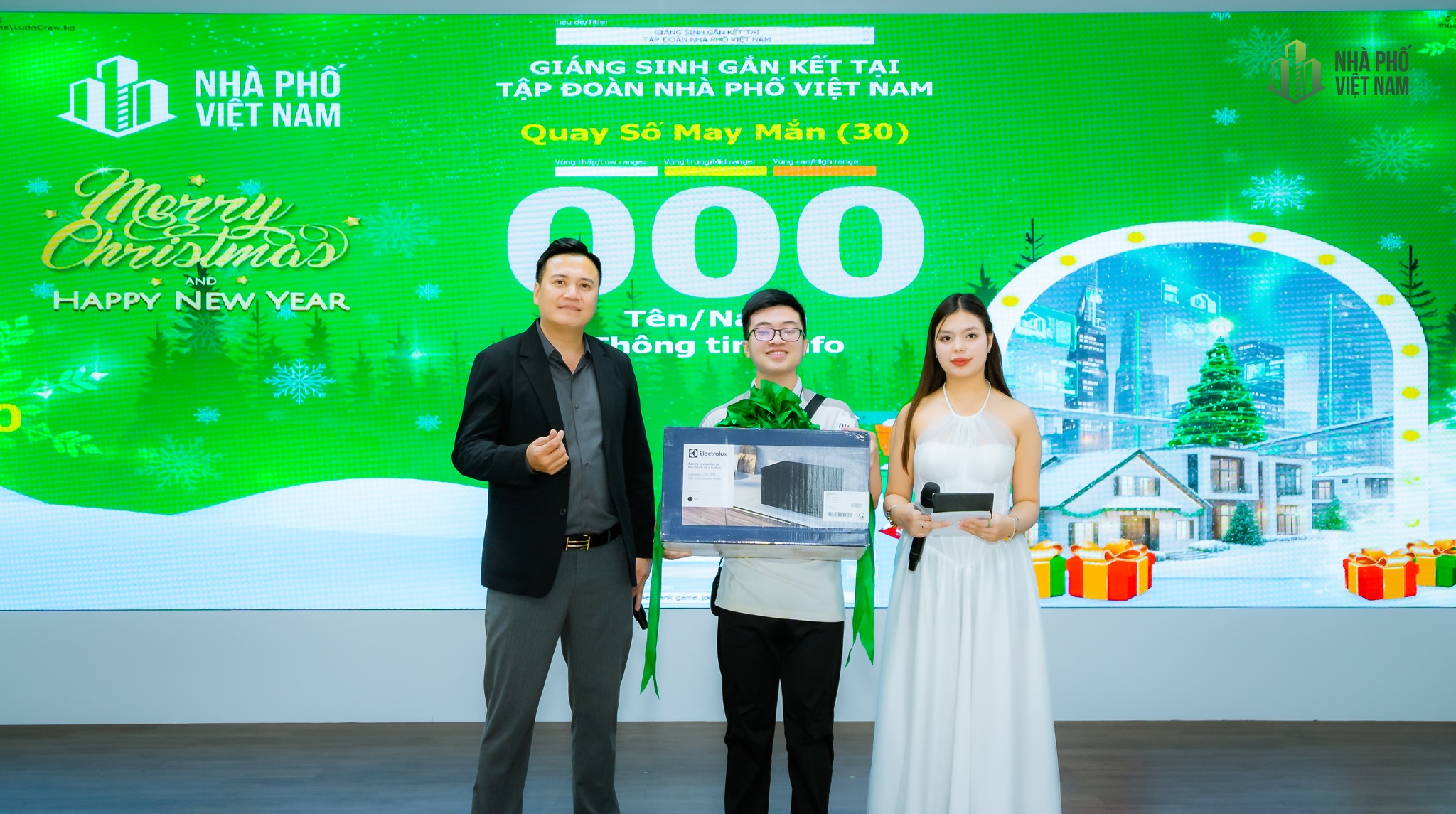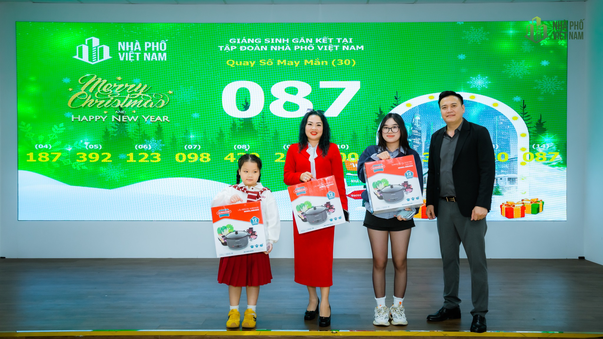 Phần Quay số trúng thưởng đã khép lại chương trình trong sự hồi hộp và vỡ òa cảm xúc. Hàng loạt phần quà ý nghĩa từ ông già Noel như sạc dự phòng, nồi lẩu, quạt cây, lò vi sóng… đã được trao tận tay các thành viên may mắn, như một lời chúc an lành và tri ân sâu sắc từ Ban Lãnh đạo Tập đoàn.